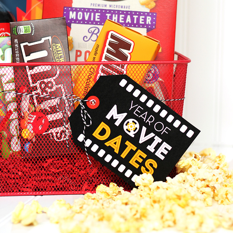 The movie gift basket packaging printables contain gift tags to tie up your cute basket, and a card explaining the gift! This is the perfect gift for your spouse on Valentine’s Day, an anniversary or even a sweet bridal shower or wedding gift for newlyweds! Don’t forget to pack your gift basket with movie candy and popcorn too!