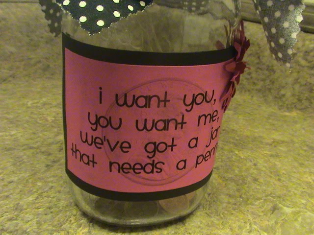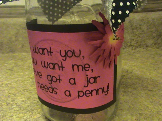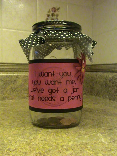 “It’s also a good code name. i.e. “I want to put a penny in our jar. Should we put the kids to bed?” And no one would know what you were talking about! It was a pretty simple project to do and even my husband loves the idea! The project of making the jar itself was, as I said, pretty simple. Just print out the saying on paper, glue it on to some other paper, cut out some ribbon and glue it on, get a flower or something and glue it on, cut out some fabric also cutting a hole in the middle for the penny slot, and twist the lid on!” – Mindi