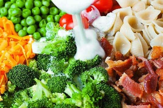 76. Bacon Ranch Pasta Salad – Bacon, pasta, and ranch (plus a few other ingredients) combine to make one tasty salad.