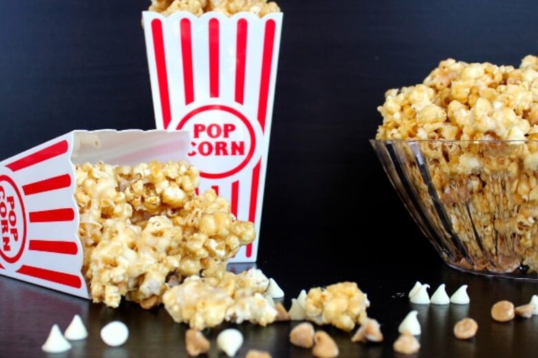 95. White Chocolate Peanut Butter Caramel Corn – Caramel popcorn is the perfect treat for a party. Try popping it in some cute popcorn bags.