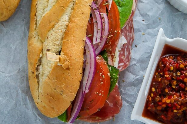 78. Italian Sandwiches – This recipe has layers of pepperoni, salami, ham, giardiniera, and mozzarella tucked into a sandwich roll and baked to melty perfection.