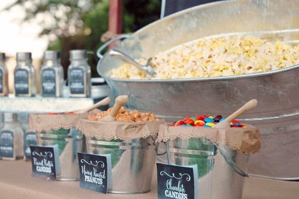 58. Popcorn Bar – If you want to offer some food to your guests but not a complete meal, consider setting up a fun popcorn bar with all the fixings.
