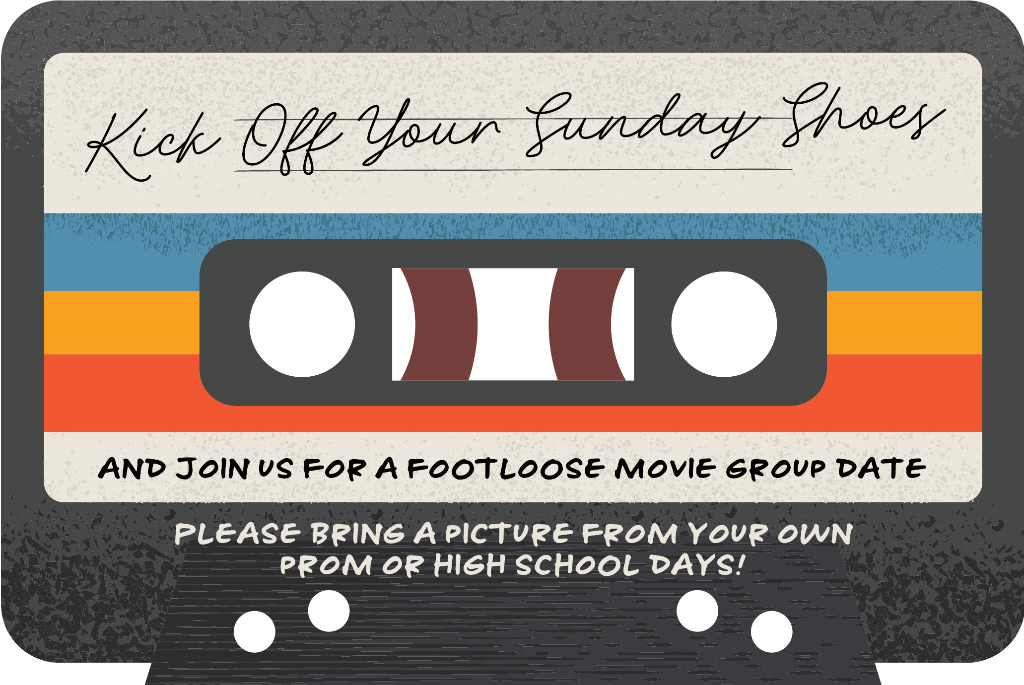 The invitation reads, “Kick off your Sunday shoes and join us for a Footloose movie group date!” You can write the “Date,” “Time,” and “Place” in the spaces provided.