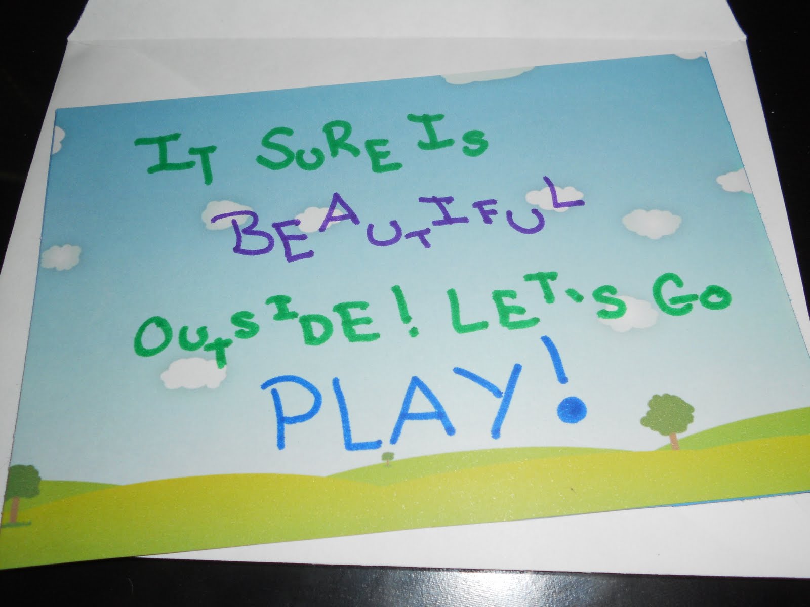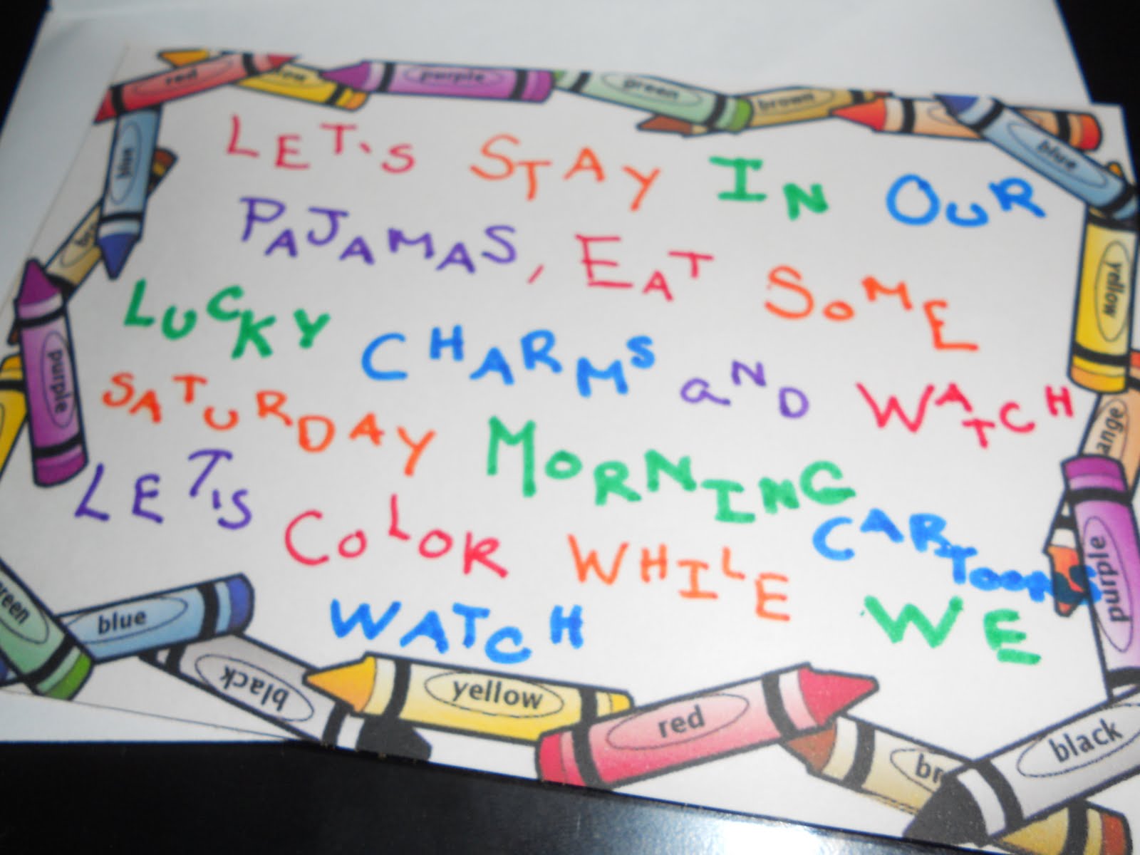 As we were coloring we realized it took a lot to color!! But it was totally worth it and fun. =) After we got done watching our morning cartoons I let my husband play his usual game of Madden 10 (football). While he did that I got ready for the day and then he proceeded to do the same. After we were all ready he opened his next card:
