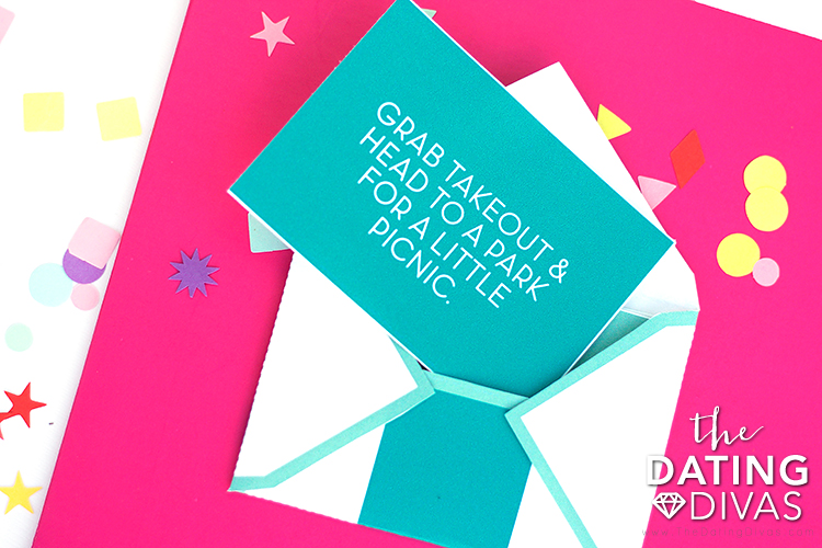 All three of the envelopes, Activity, Dinner, and After Dark, fit inside of the last envelope. You can pack the smaller envelopes into the larger one and draw out a blind date idea card from each one as the evening goes along.