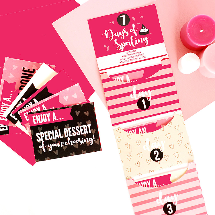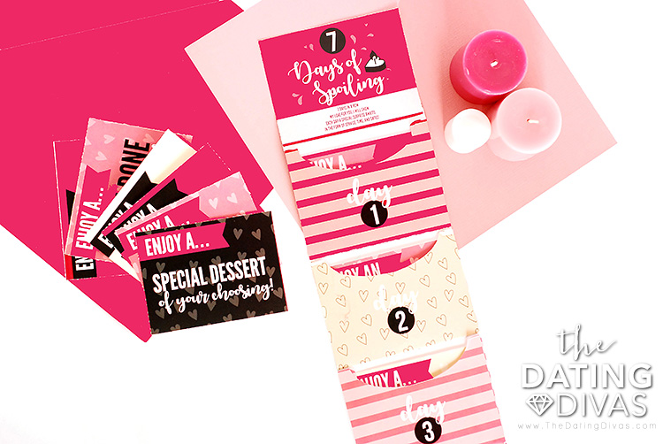 Display your weeklong gift of surprises in this unique envelope pocket countdown. Seven different printable envelopes are linked together to form little pockets where you can place the surprise card inside. Learning how to pamper your wife or husband never got easier, folks! We’ve done all the work for you!