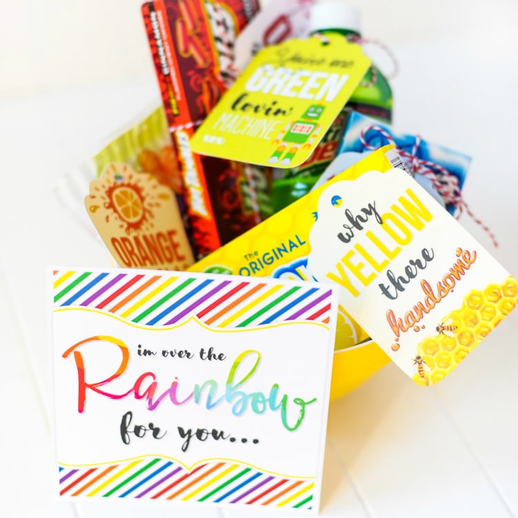 We’ve included FIVE different printable gift tags to go along with different colored gifts. The best part is how versatile this gift is. You can attach the tags to ANY gift that matches the color, so it’s easy to personalize and customize your gifts to your sweetheart’s preferences. We chose snacks, candy, and a drink, but the options really are endless. It would also be fun to do different colors of clothes and accessories like a blue phone charger, or a green water bottle — the possibilities are endless!