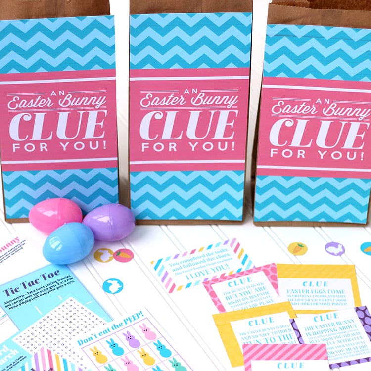 This creative Easter Bunny Hunt leads you through your home in search of 6 different clues. Crystal at A Well Feathered Nest did such a beautiful job designing this Easter Hunt for us! The games and challenges are just so stinking cute, I can barely stand it! There is a family game or challenge in each bag that needs to be completed before moving on to the next clue. Your family will have a BLAST working together to complete each one!