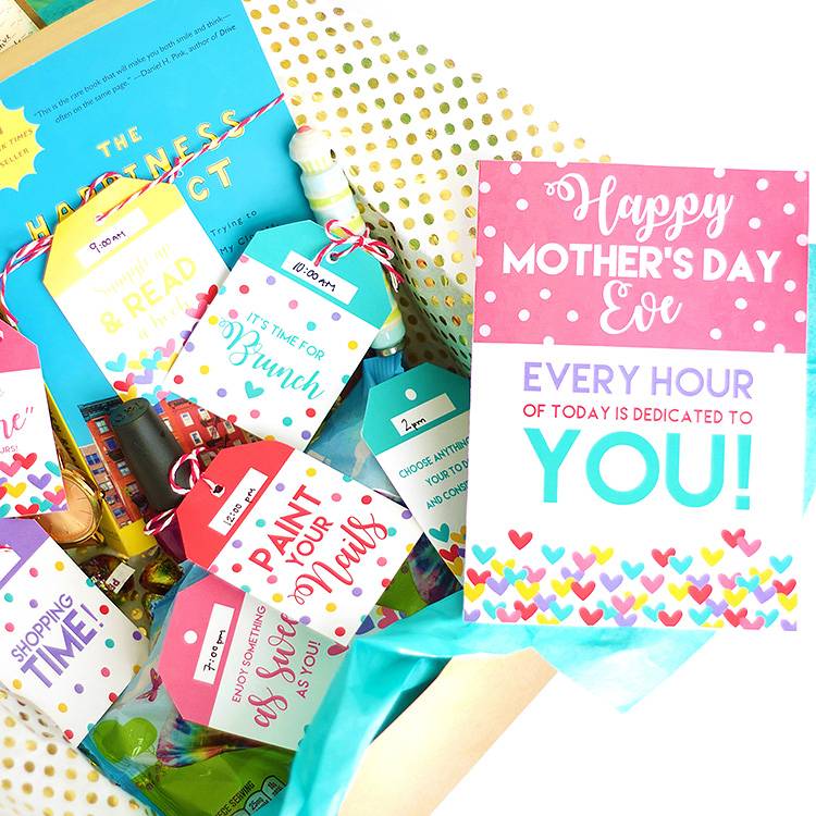 Start a tradition that your mom will love! Every Mother’s Day, instead of celebrating Mom only on Sunday–which may be typically spent at church, or visiting your mom, in-laws, grandmas, etc.–also celebrate “Mother’s Day Eve” on Saturday. This will be not only a Mother’s Day gift that will make her feel appreciated but also a Mother’s Day tradition that she will look forward to all year! Create your own Mother’s Day Eve tradition by celebrating her ALL DAY. Every hour of the day will be planned out with either a sweet, small gift or a little activity for Mom to do and enjoy!