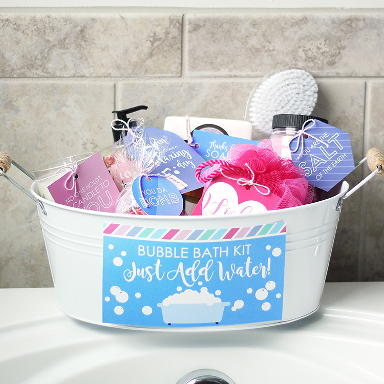 To add some extra love to your relaxing gift for mom, you can use fun gift tags on each of the bath products you add to the bubble bath kit. We made 12 tags to hopefully cover lots of different options of items to put inside the gift basket. Save these gift basket tags on Pinterest to use again and again.