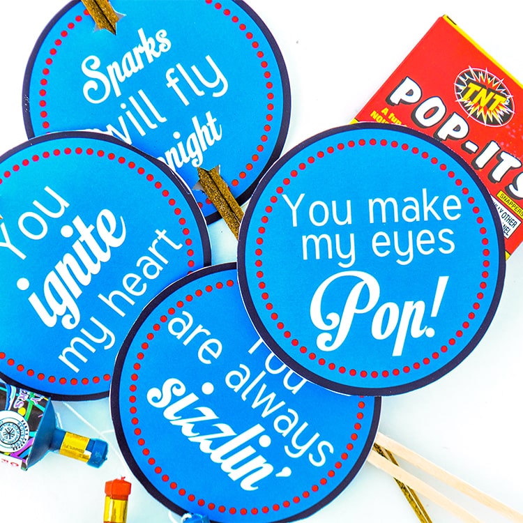We paired the printables with the long matches that are used to light fireplaces because they are just so cute! {And hey! No burned digits!} You could always attach them to regular size matches or a lighter. The Pop-its are a must at our house, so those were super easy to find, as were a couple sparklers. To attach the little gifts, we used our old friend, glue dots! For the longer matches and sparklers, it was also really easy to just punch a hole in the top and bottom of the tag and slide them through. We used a star punch {this one comes with a heart punch, too!} to be EXTRA festive.