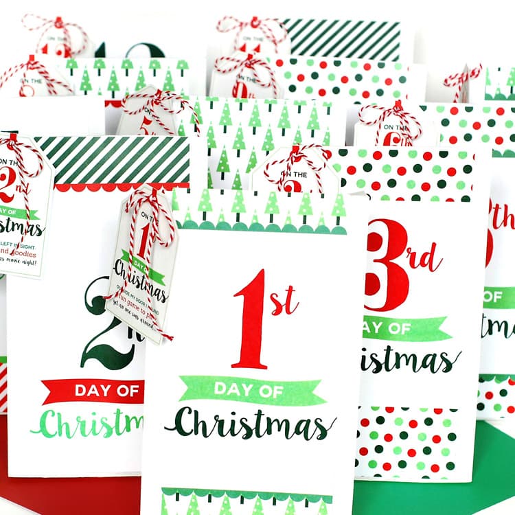 Label your daily gift with one of the 12 Days of Christmas poem gift tags. The pack includes two versions: one for a neighbor and one for your spouse. Each poem corresponds to the song “The 12 Days of Christmas” and alludes to the gift to be given.
