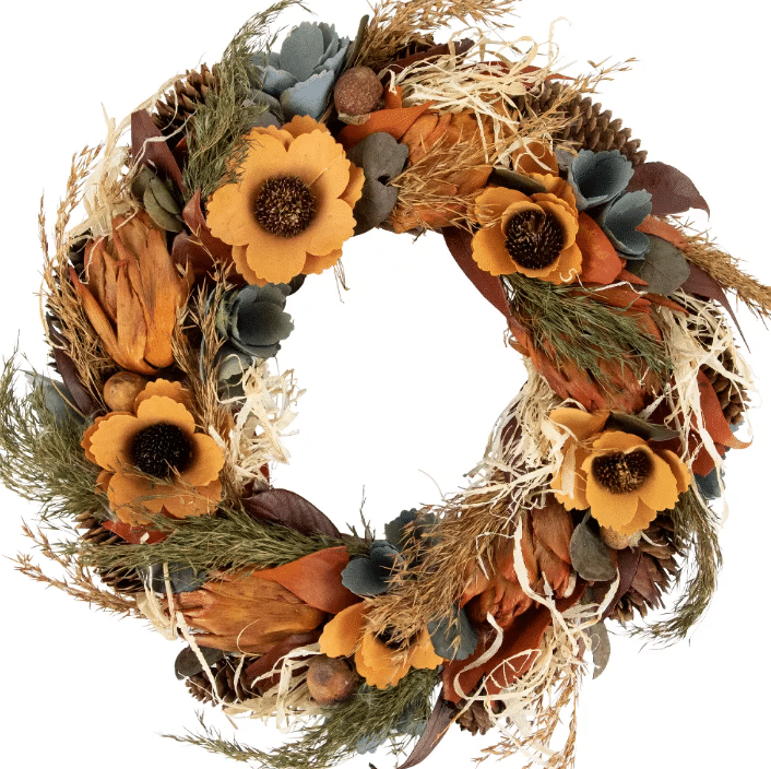 43. Sunflower and Straw Fall Harvest Wreath: We can’t get over how amazing this wreath is. Great for indoors and outdoors!